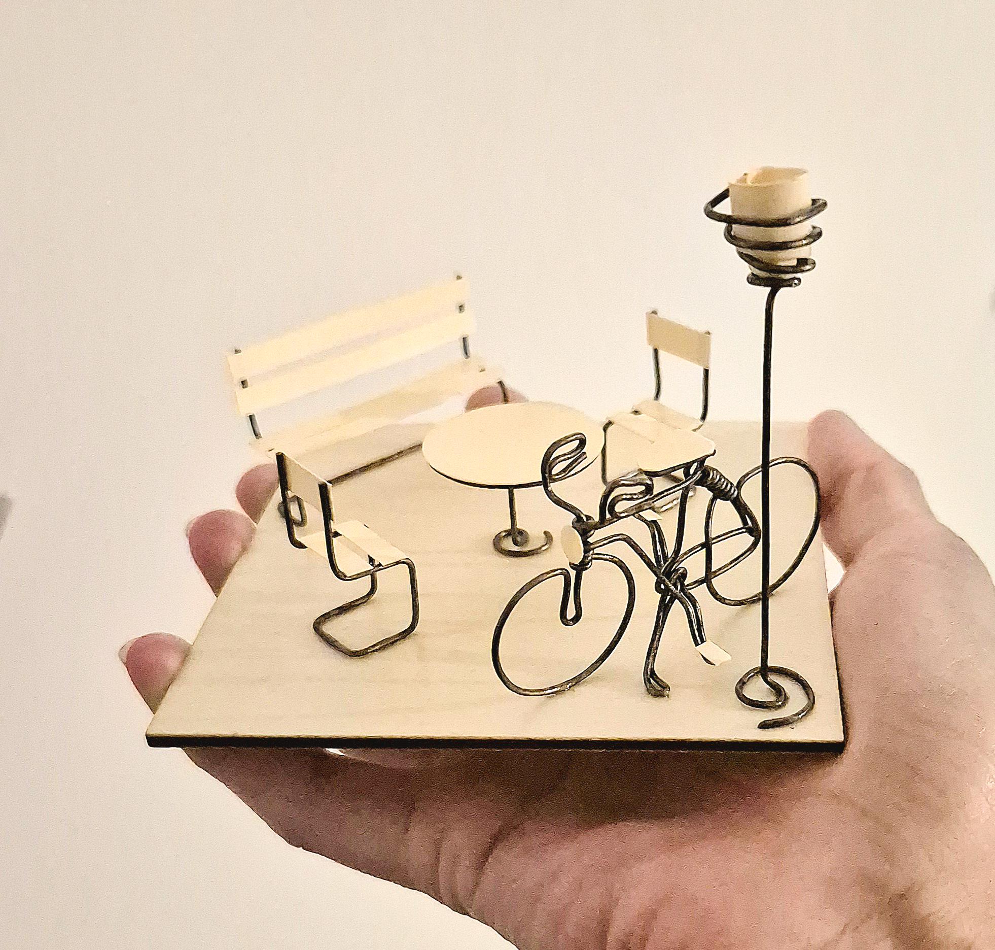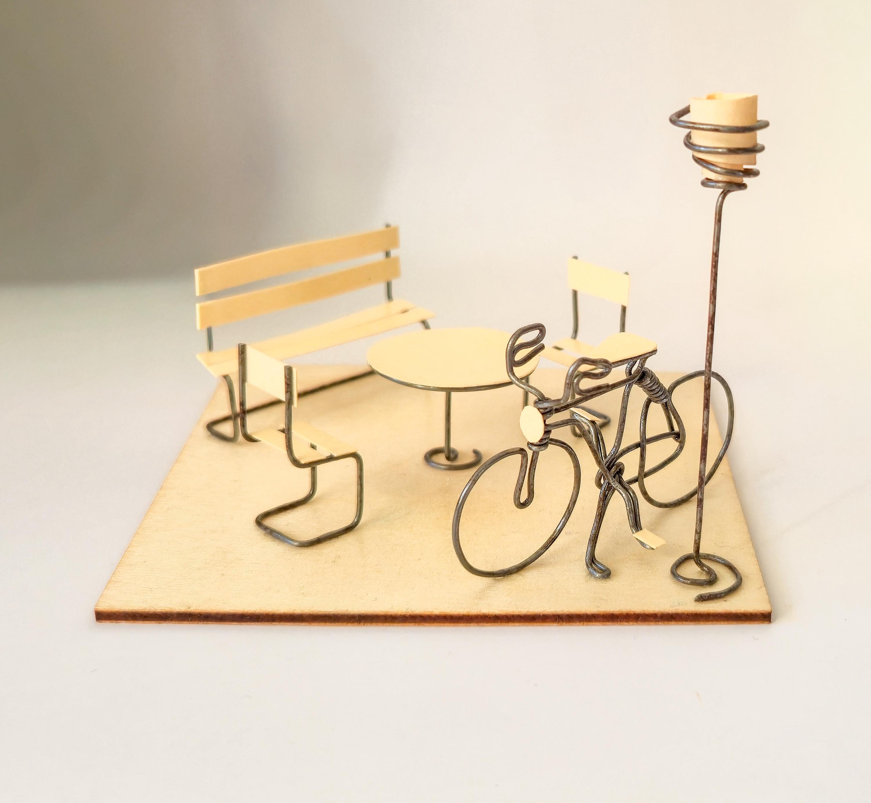 Miniature diorama in wood, metal and paper for interior decoration, cycling scene, 10x10 cm