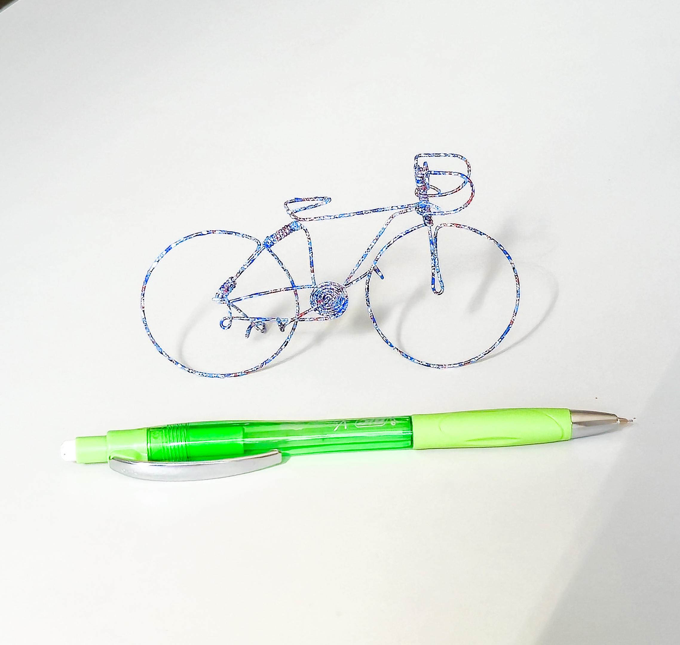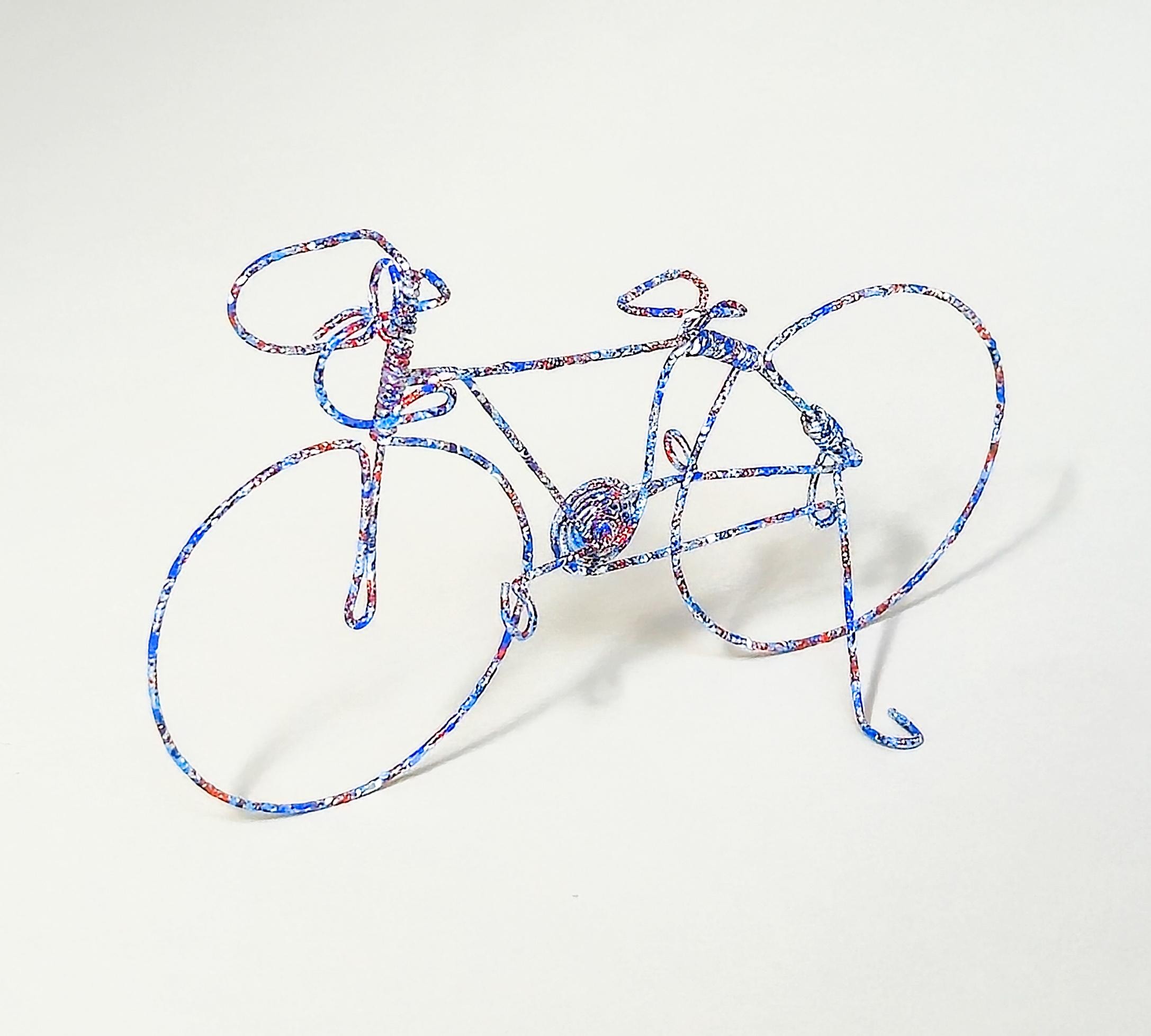 🎨 Matériaux : vélo artisanal entièrement réalisé à la main avec du fil de fer, puis peint à l'acrylique avec projection de peinture au pinceau. Il est ensuite légèrement verni.