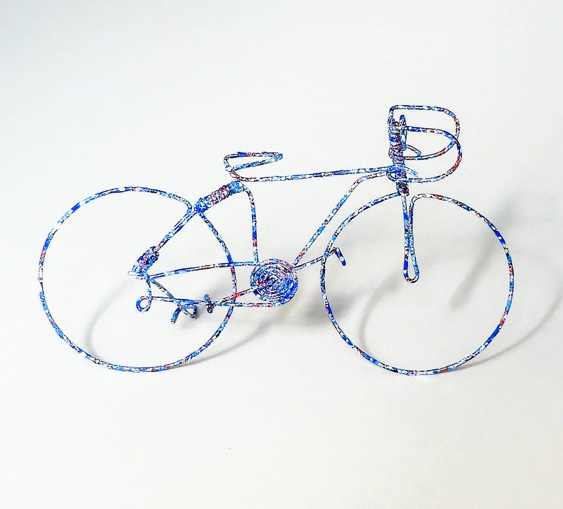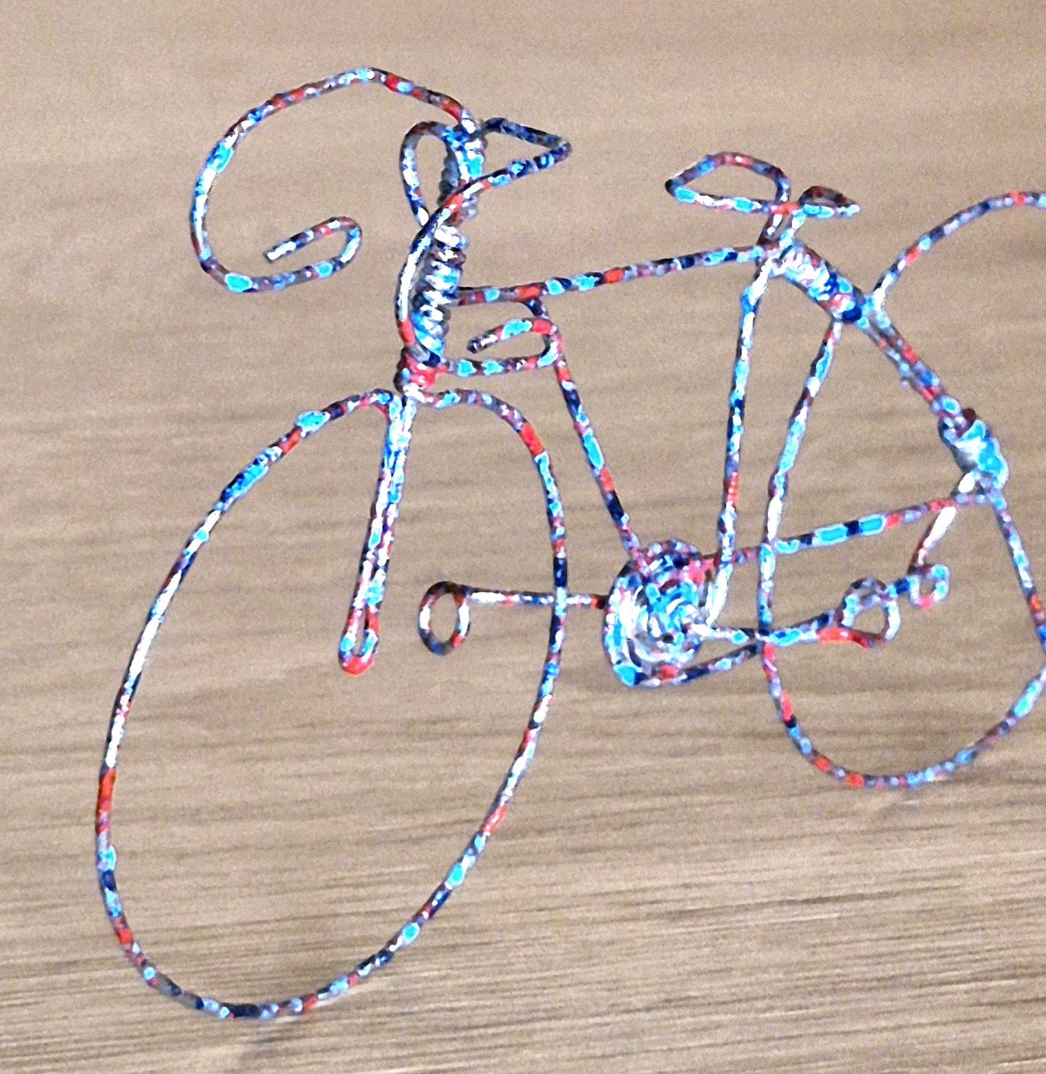 🎨 Matériaux : vélo artisanal entièrement réalisé à la main avec du fil de fer, puis peint à l'acrylique avec projection de peinture au pinceau. Il est ensuite légèrement verni.
